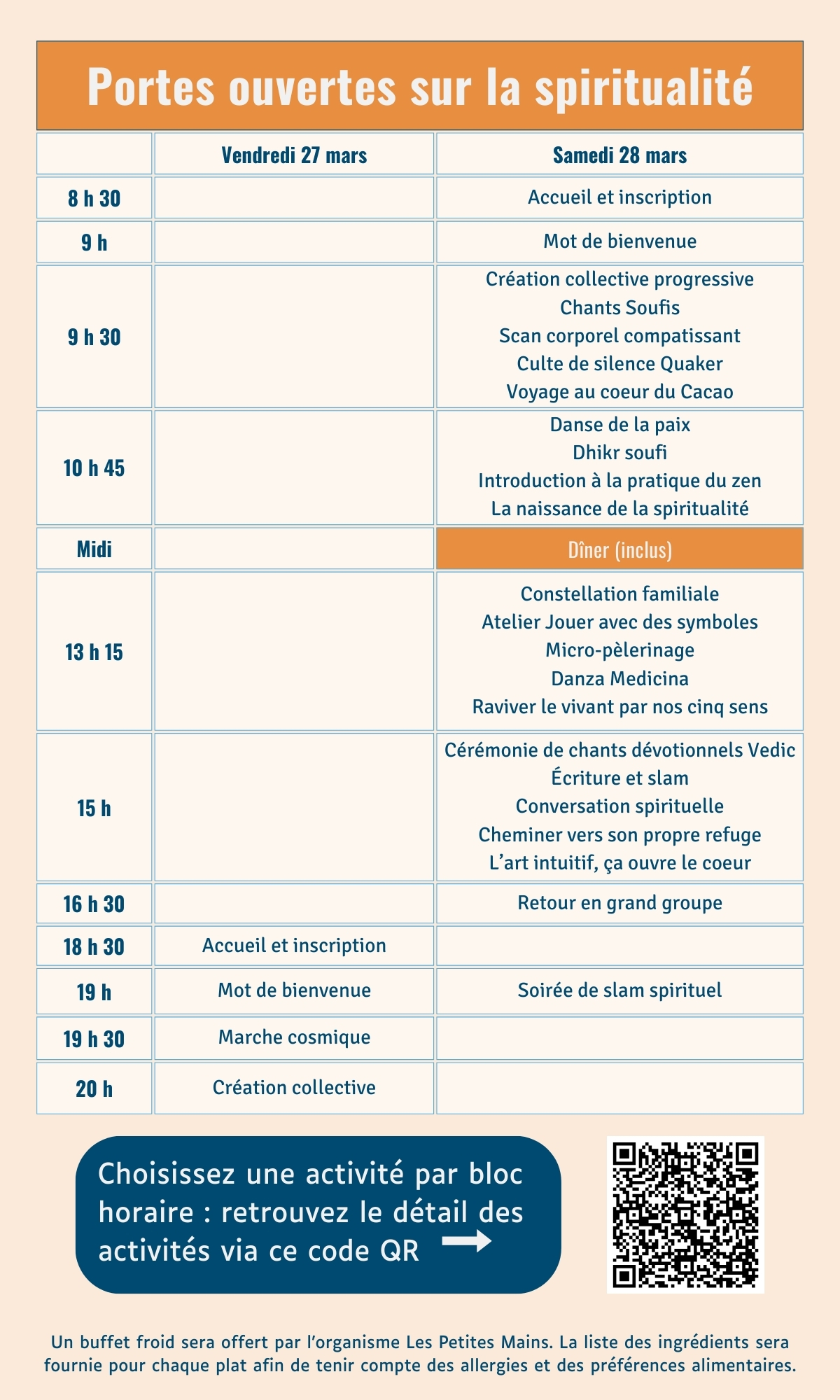 Et si on explorait la spiritualité autrement? Cette journée vous invite à découvrir diverses approches spirituelles, traditionnelles ou contemporaines, dans un cadre sécuritaire, inclusif et respectueux. Par la pratique, le dialogue et le partage, vous serez invité·e à vivre une expérience personnelle et collective de la spiritualité : ce qui vous nourrit, vous inspire, vous relie. Chaque personne pourra choisir les activités qui l’interpellent et s’y inscrire à l’avance. Un espace pour se ressourcer, réfléchir et rencontrer l’autre en profondeur. En soirée : une activité de slam sur la spiritualité viendra clore la journée en beauté. Une invitation à vivre une spiritualité incarnée, libre et ouverte.